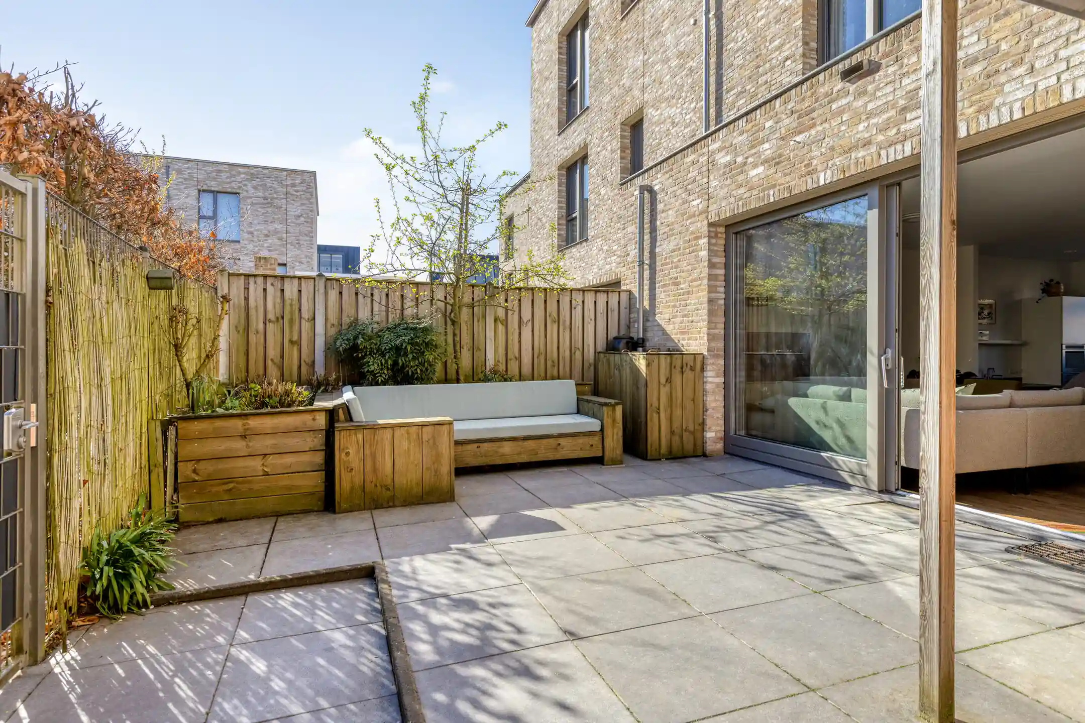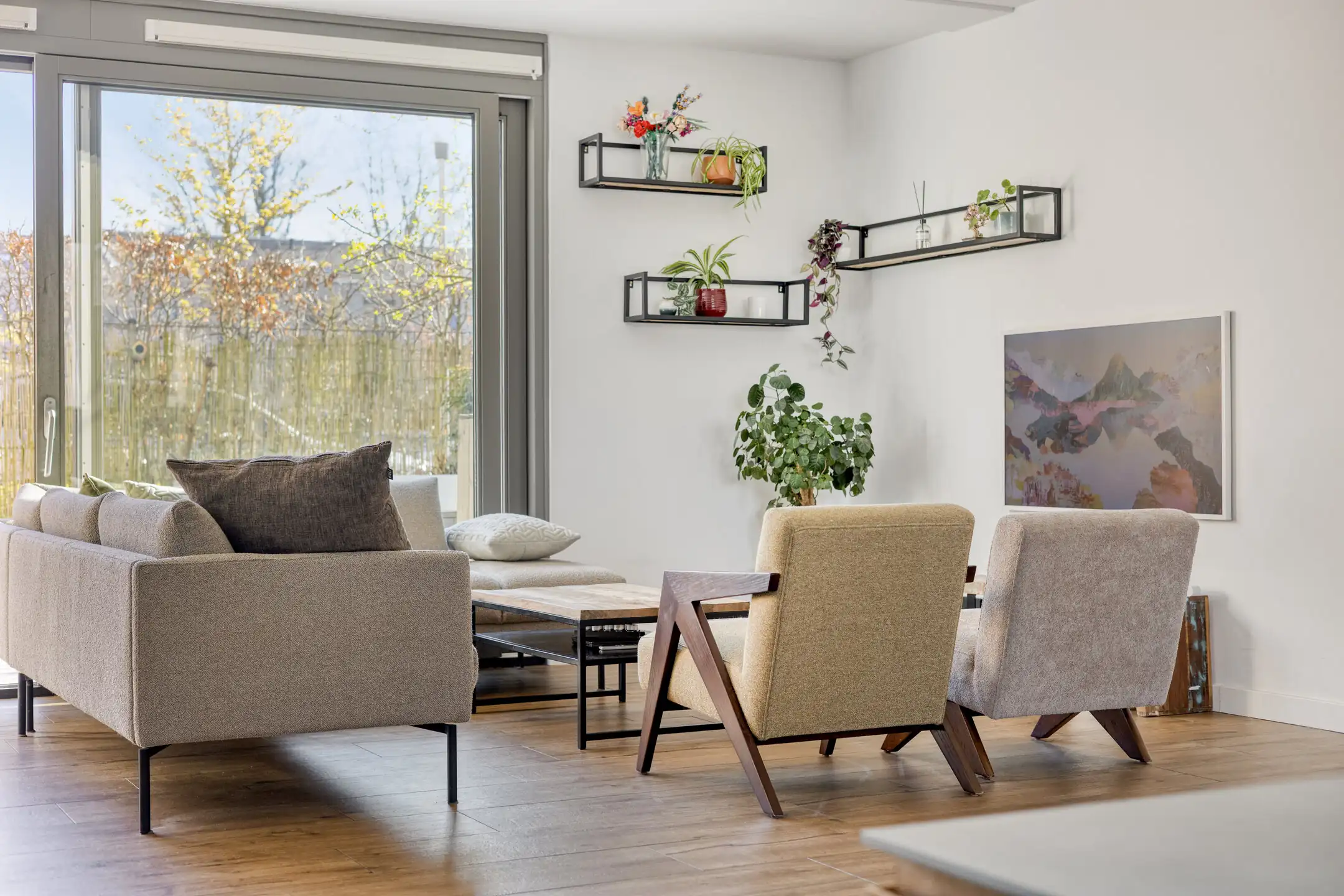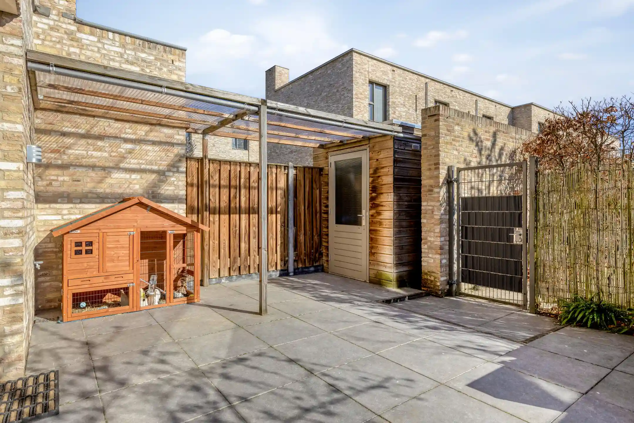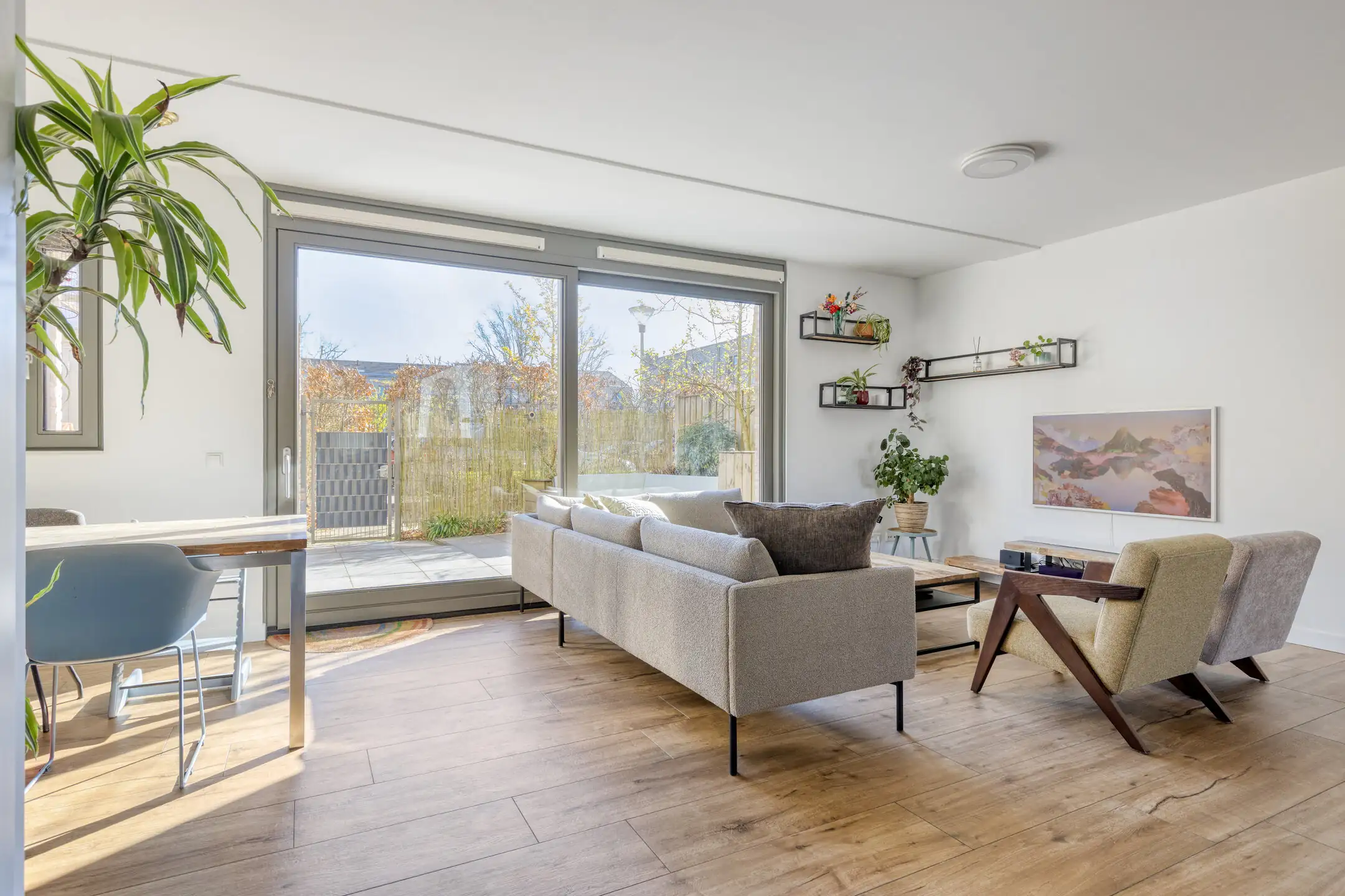 Via de schuifpui aan de achterzijde wordt de tuin op zonnige dagen echt een verlengstuk van de woonkamer, waardoor binnen en buiten moeiteloos in elkaar overlopen.