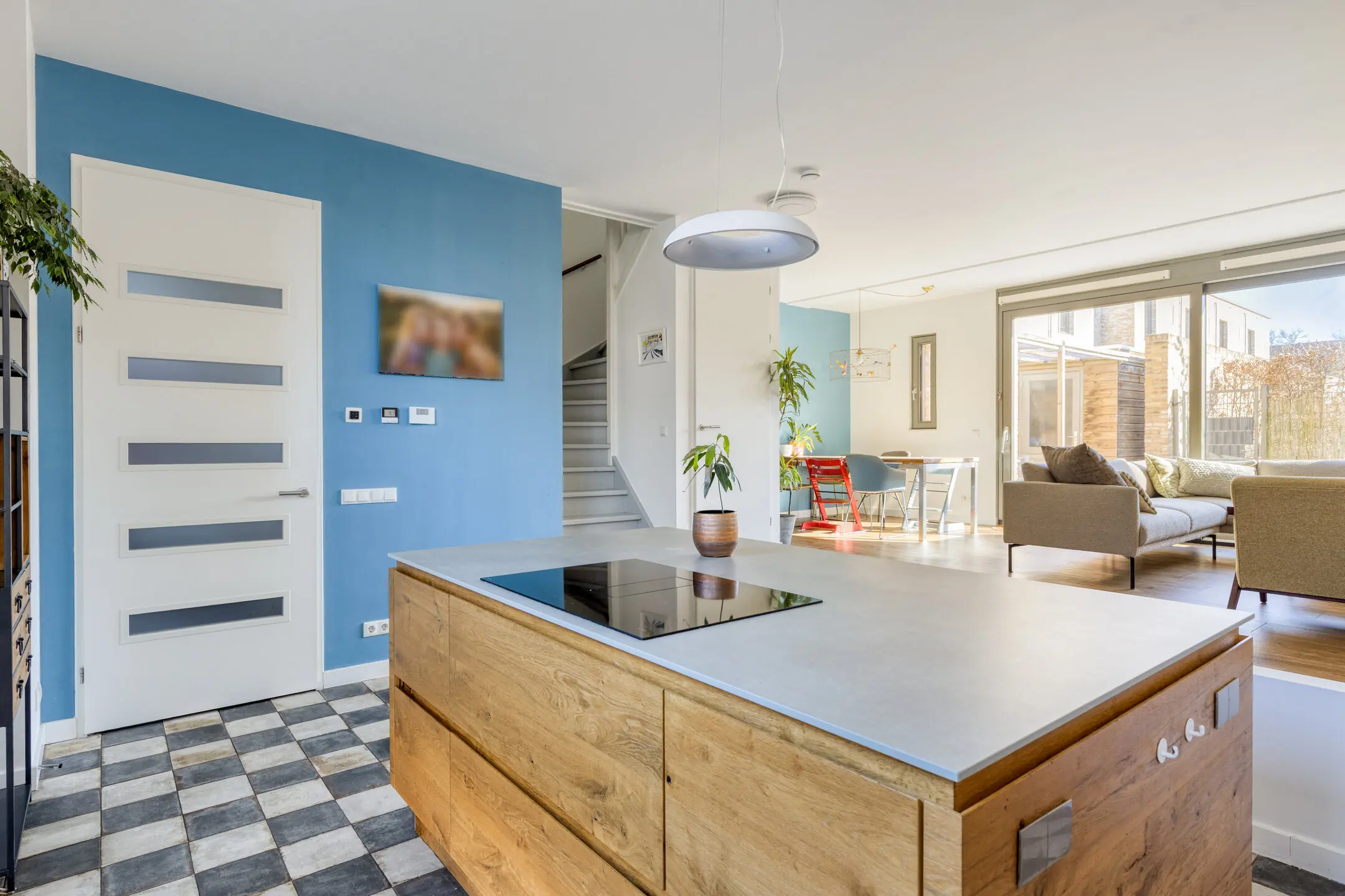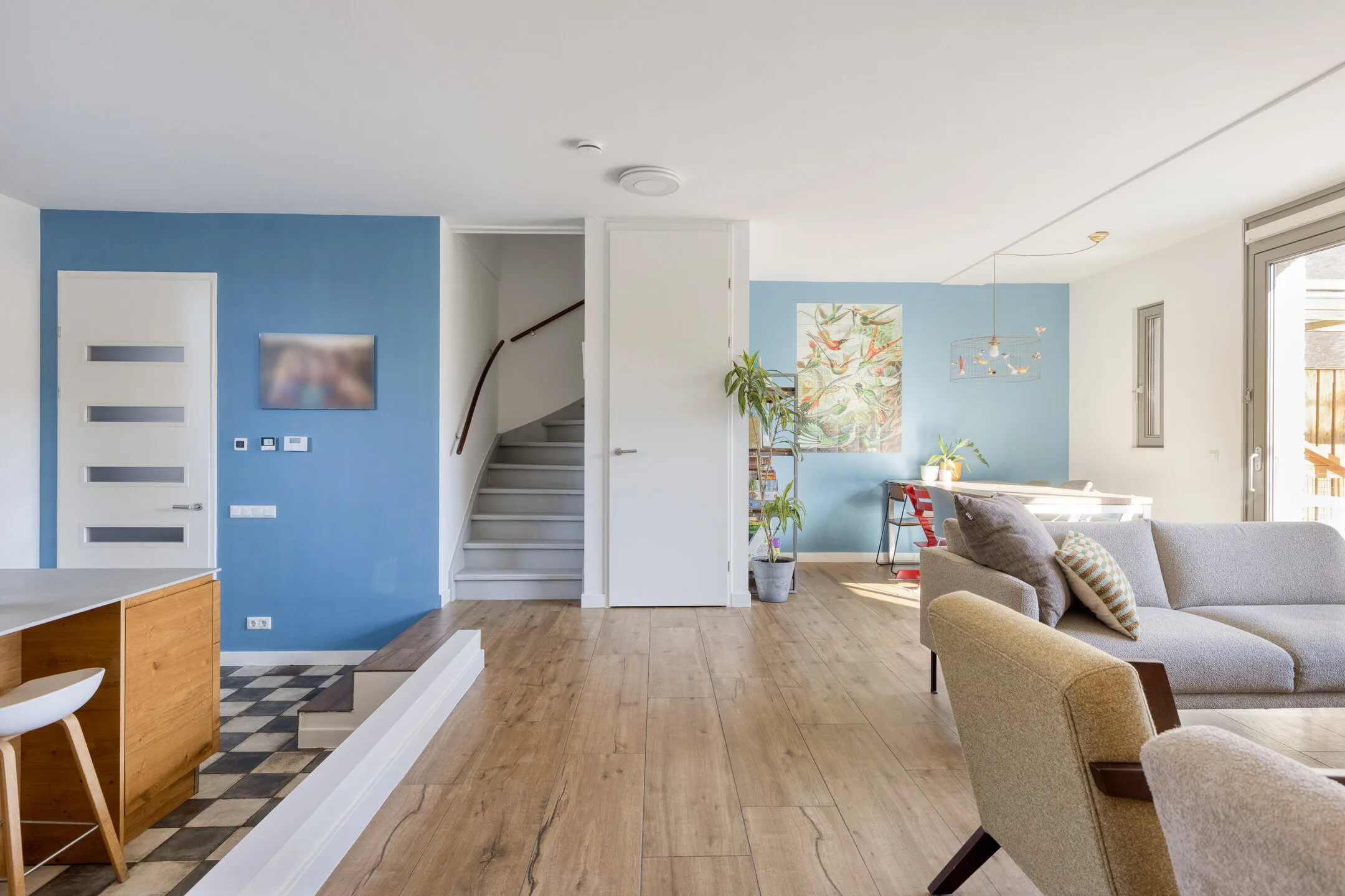 De woonkamer en keuken staan in open verbinding met elkaar en vormen samen een royale en gezellige leefruimte. De woonkamer is vanuit de keuken te bereiken via een opstap, wat zorgt voor een speelse en ruimtelijke indeling.